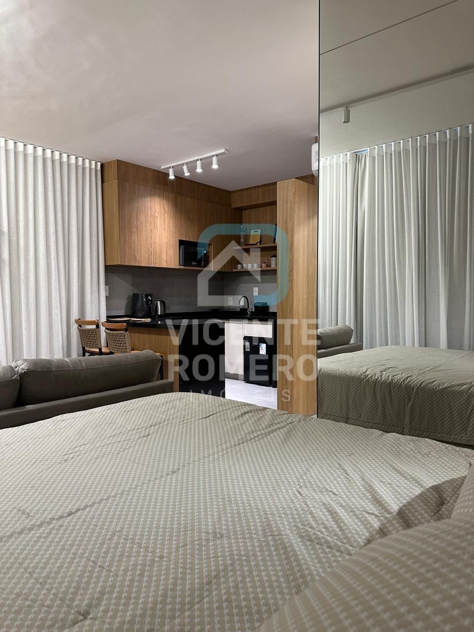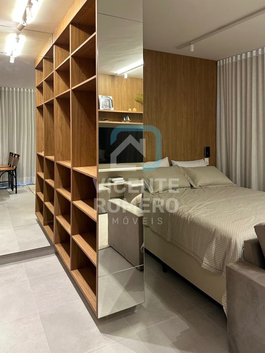 quarto, sala e cozinha integrados, todos com móveis planejados